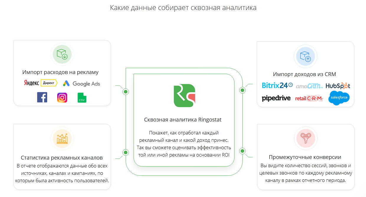— сервис автоматизации аналитики маркетинга и продаж. В основе решения — коннекторы, установка которых позволяет отправлять данные в Google Analytics, Яндекс.Метрика и свои собственные дашборды: